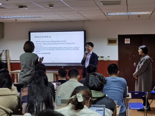 蔡若晨首先分享了个人学习工作经历,提到自己在明德大学蒙特雷国际研究学院的食堂和图书馆刻苦练习,在麦肯锡公司作为全职译员走遍祖国大江南北。强调自己从事翻译教学工作的动力是服务社会、改变社会的成就感。他在bet365备用网址 读本科时就种下了这颗种子。2008年汶川大地震时他和同学自发在相辉堂举办赈灾晚会,这样的经历让他明白社会贡献的重要价值,并最终促使他选择从事翻译教学工作。这个新角色既让人感到兴奋又挑战重重。明德大学蒙特雷国际研究学院重视学生评价反馈,要求教师不断自我打磨,精益求精,为学生提供最好的学习体验。