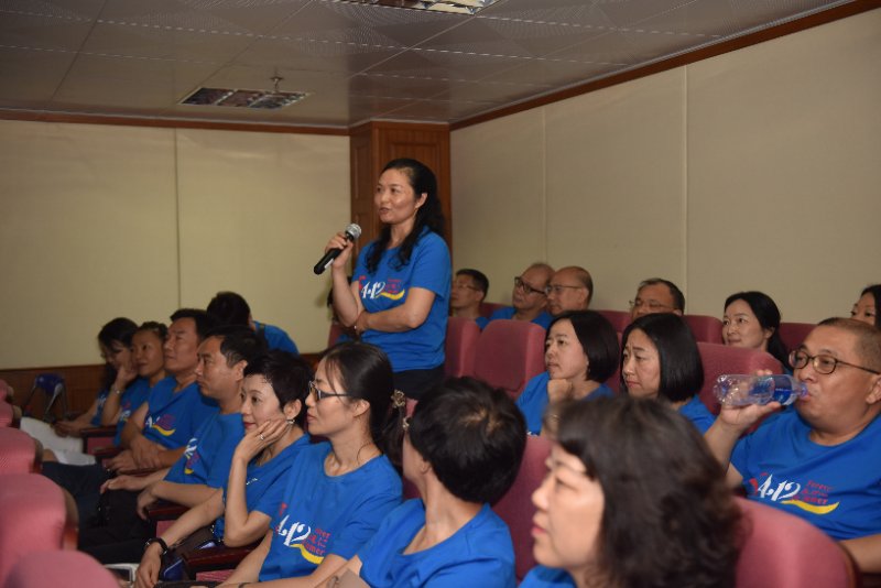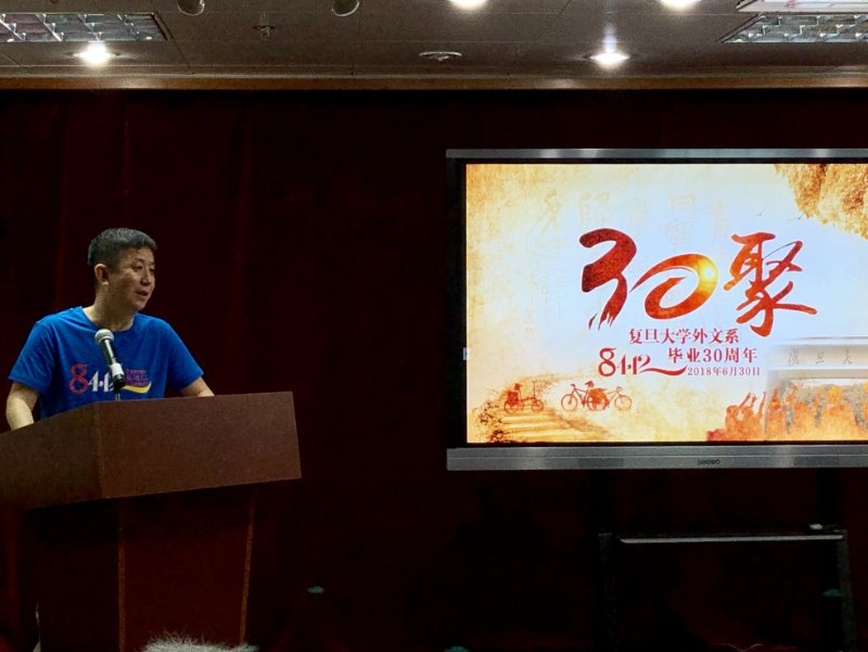 进入同学发言环节,英语(2)班老班长王时芬校友代表8412上台发言。之后,当年的5个班级各推举一位代表先后上台发言:不忘初心坚守教学岗位的英语(2)班谈峥校友、从美国赶来的日语班老班长许静校友、从韩国赶来的英语(3)班老班长杜宝明校友、从北京赶来的德语班老班长刘娟校友和从德国赶来的当年的学霸英语(1)班胡萌洁校友。大家回忆大学学习生活的点滴往事,感恩于母校和老师们的教导和培养,对师生情和同学情的真切之心溢于言表。